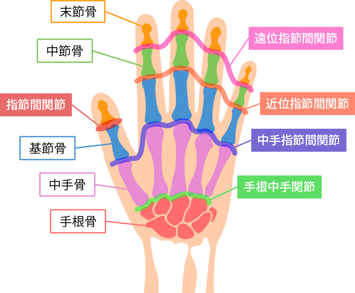 - 親指は指節間関節、それ以外の指は中手指節関節または近位指節間関節に著しい運動障害がある